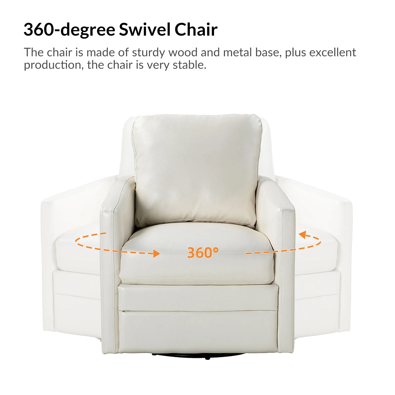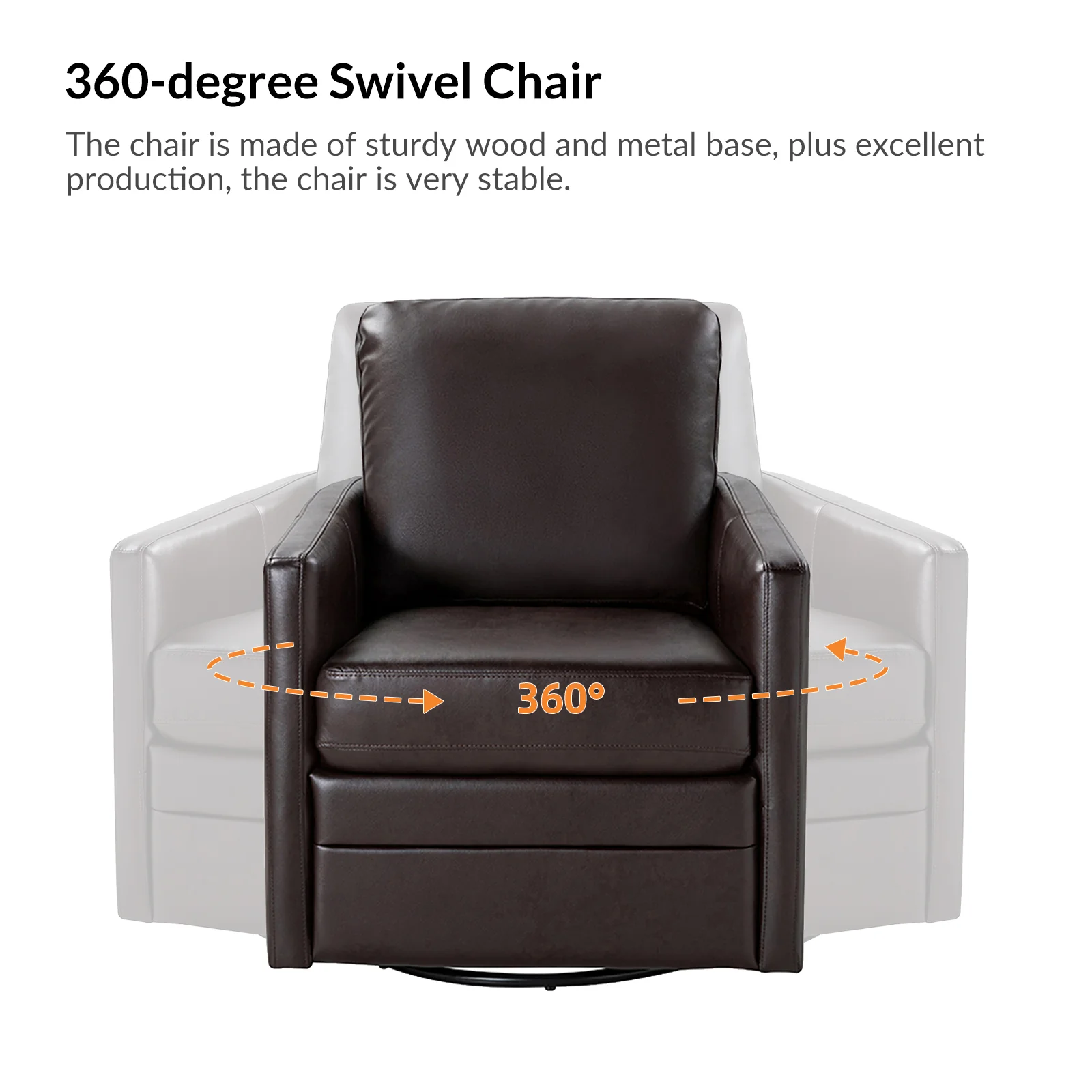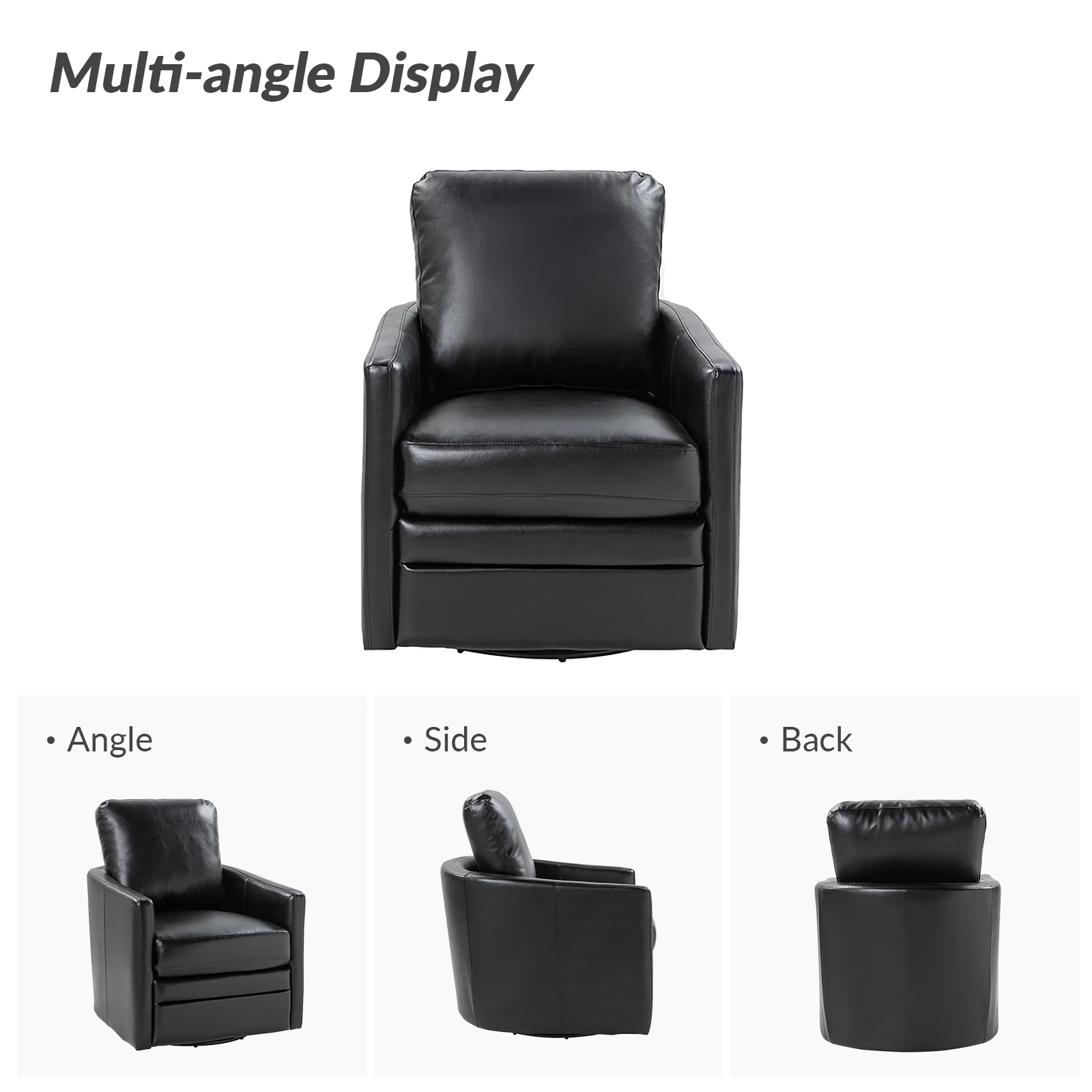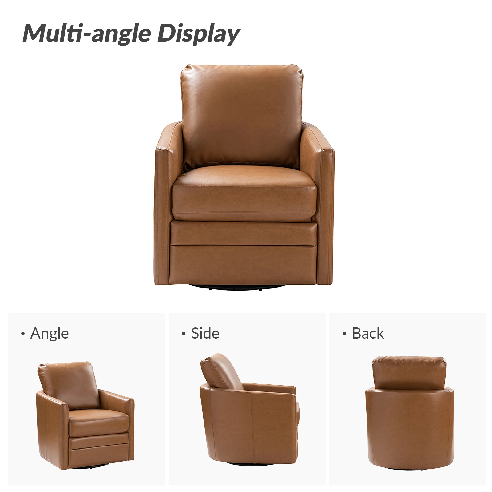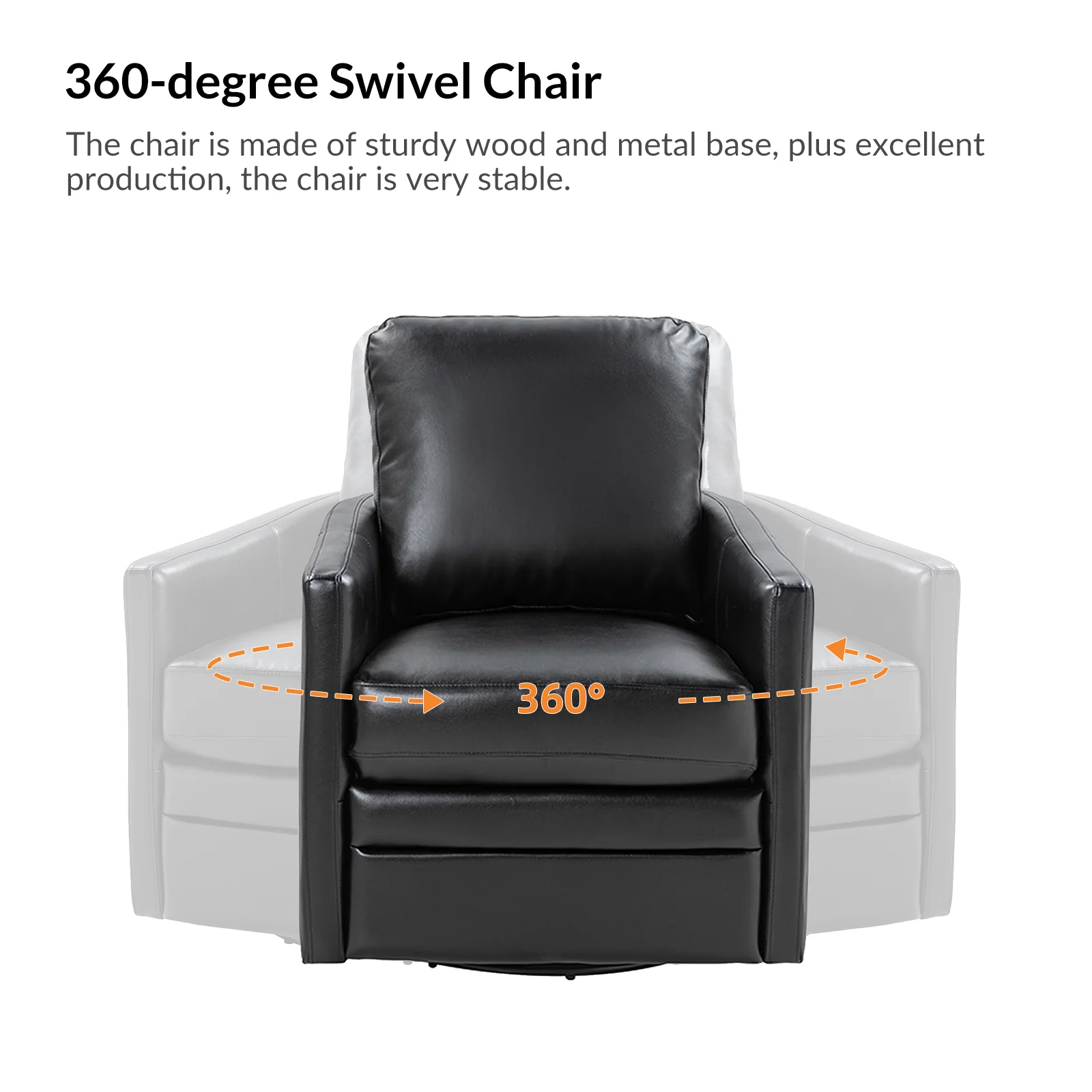 This swivel chair features PU leather upholstery and a sleek metal base for a gorgeous look in your living room. Its frame is made from solid and manufactured wood, and its circular metal base has a black finish that complements any color palette. The back cushion can not be fixed so you can remove it as your need, and the core can take out. It allows you to rest in a variety of ways and they can enhance comfort, durability, and resistance to the tests of time. The chair's comfort belies its sturdy and durable PU, built-in pocket spring, and sturdy construction. Let your body sink into the foam-filled soft upholstery, and recline the back for the ultimate in relaxation after a stressful day. This swivel chair will create a cozy, contemporary look for years to come.
