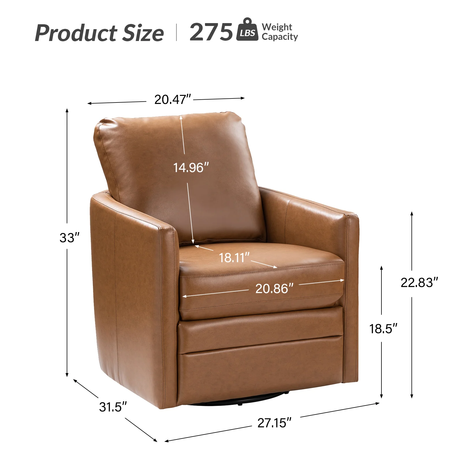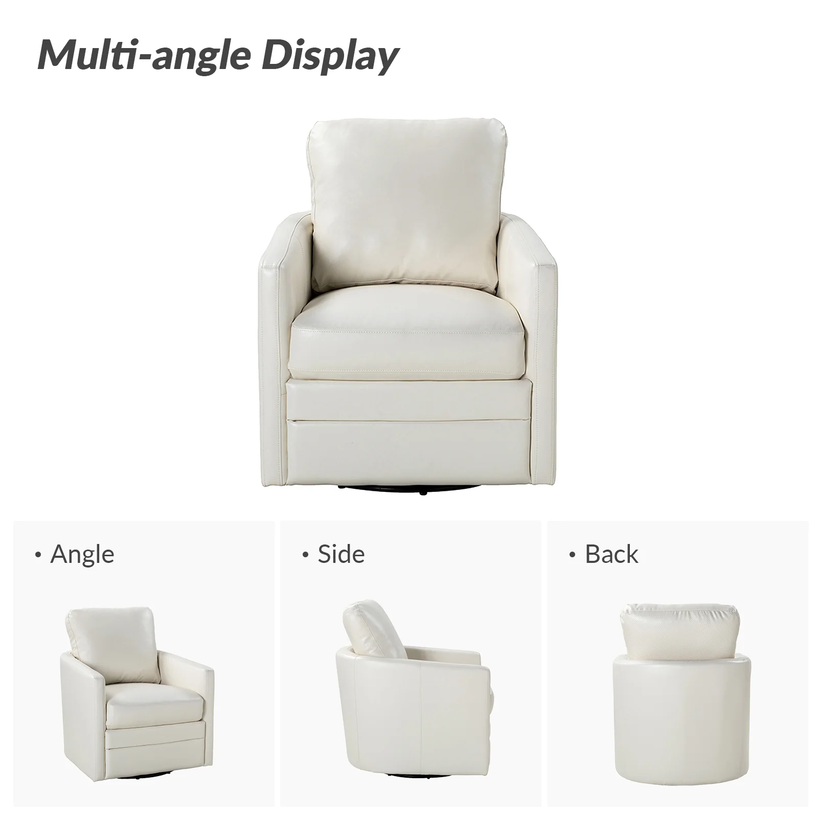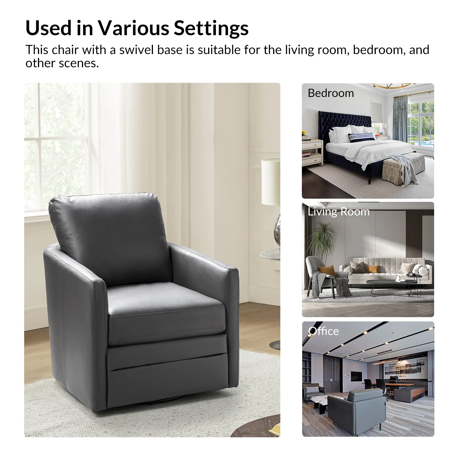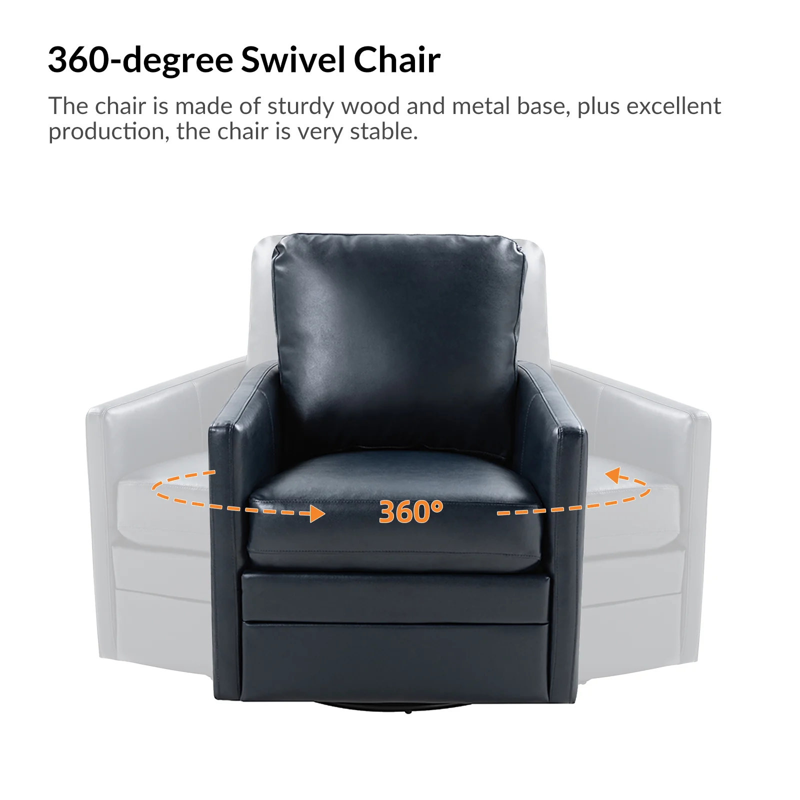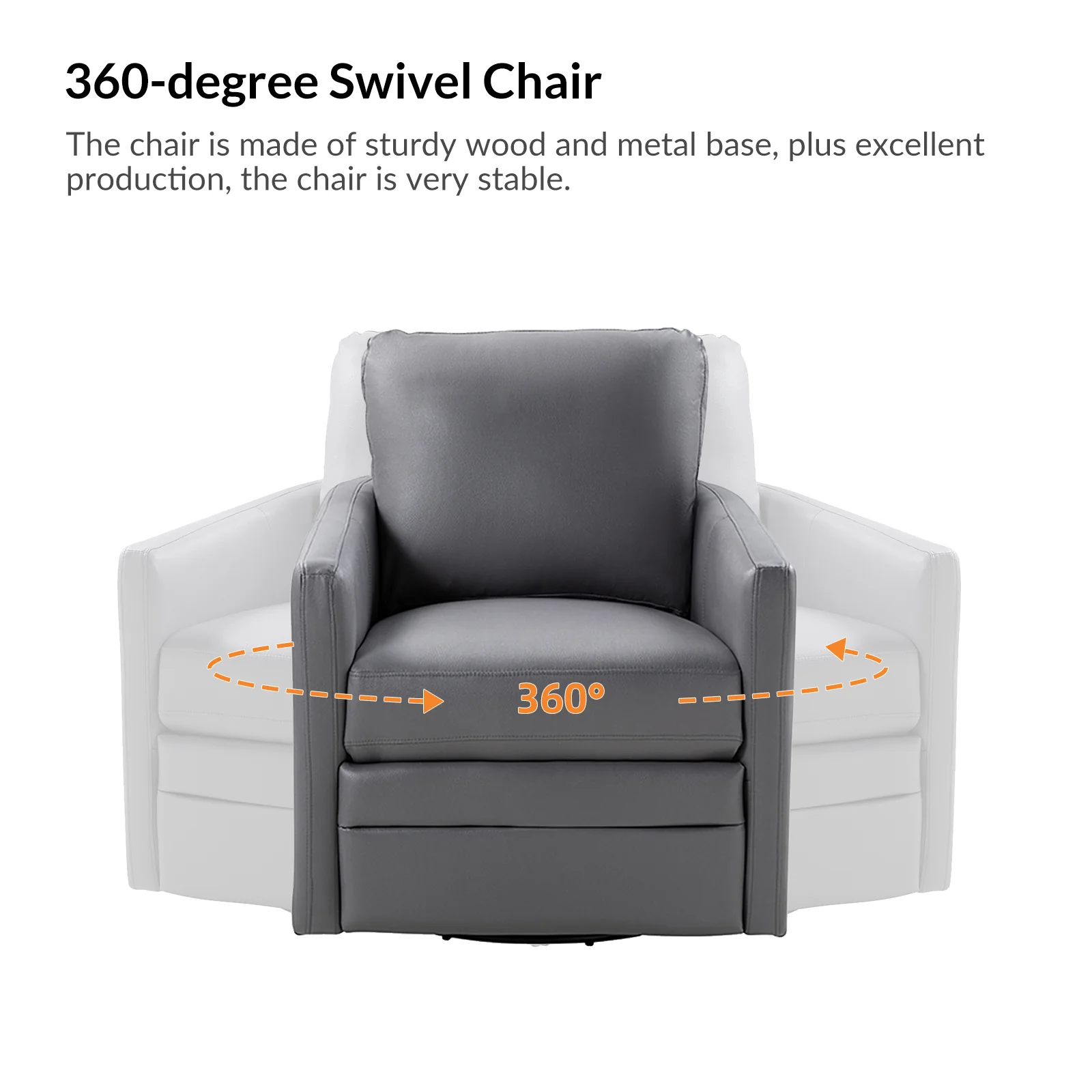 This swivel chair features PU leather upholstery and a sleek metal base for a gorgeous look in your living room. Its frame is made from solid and manufactured wood, and its circular metal base has a black finish that complements any color palette. The back cushion can not be fixed so you can remove it as your need, and the core can take out. It allows you to rest in a variety of ways and they can enhance comfort, durability, and resistance to the tests of time. The chair's comfort belies its sturdy and durable PU, built-in pocket spring, and sturdy construction. Let your body sink into the foam-filled soft upholstery, and recline the back for the ultimate in relaxation after a stressful day. This swivel chair will create a cozy, contemporary look for years to come.