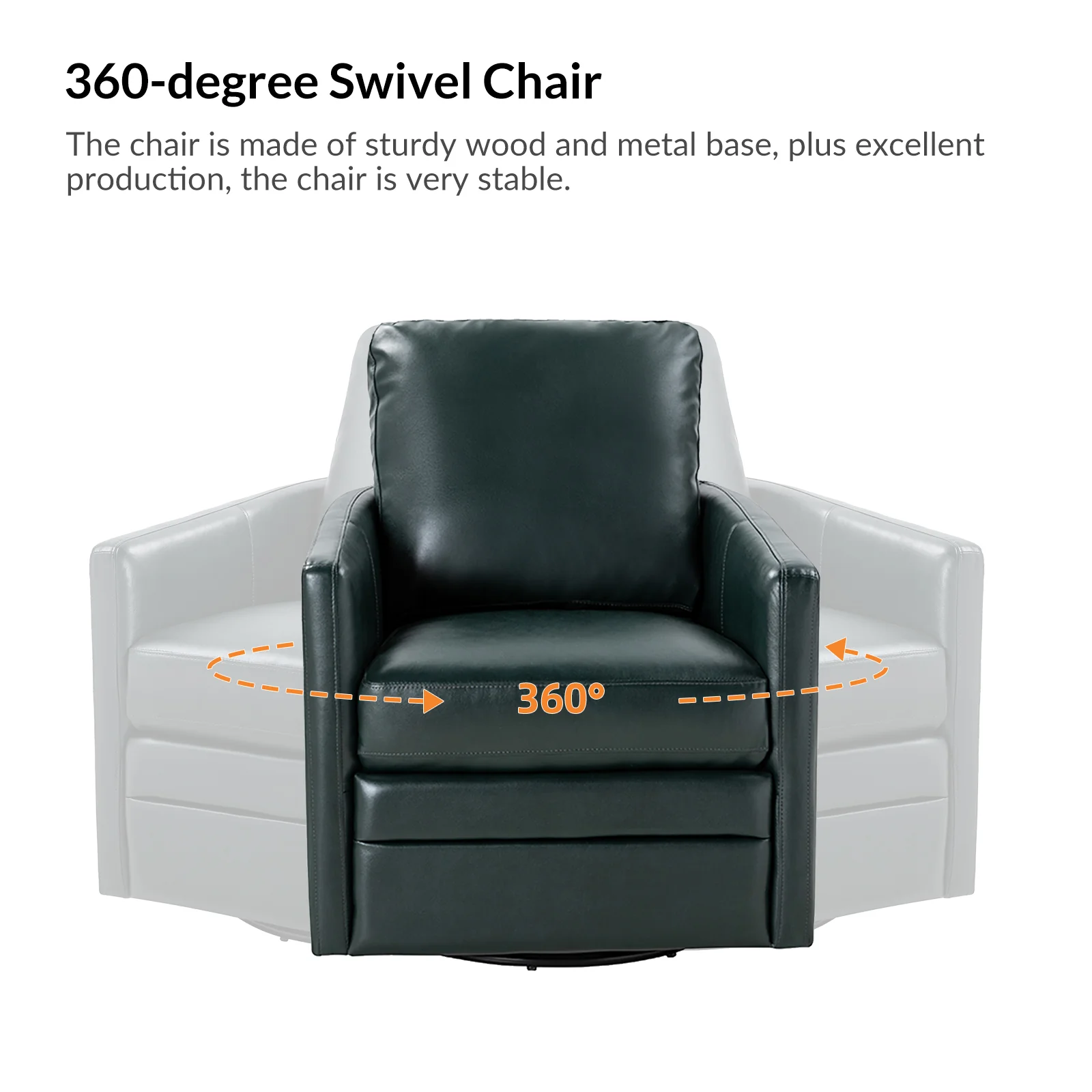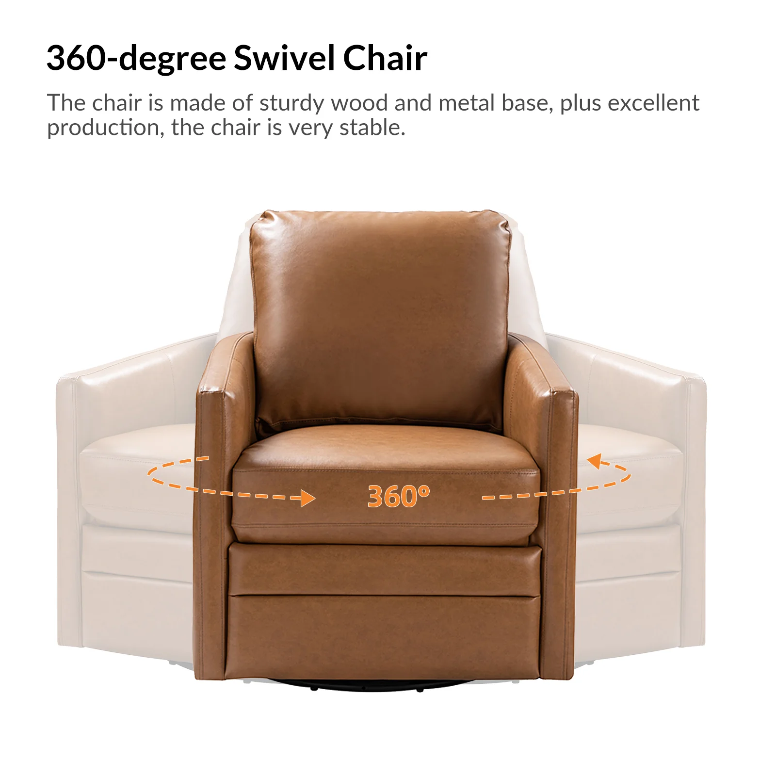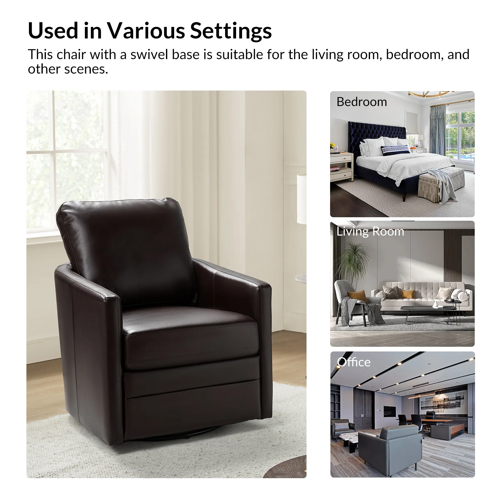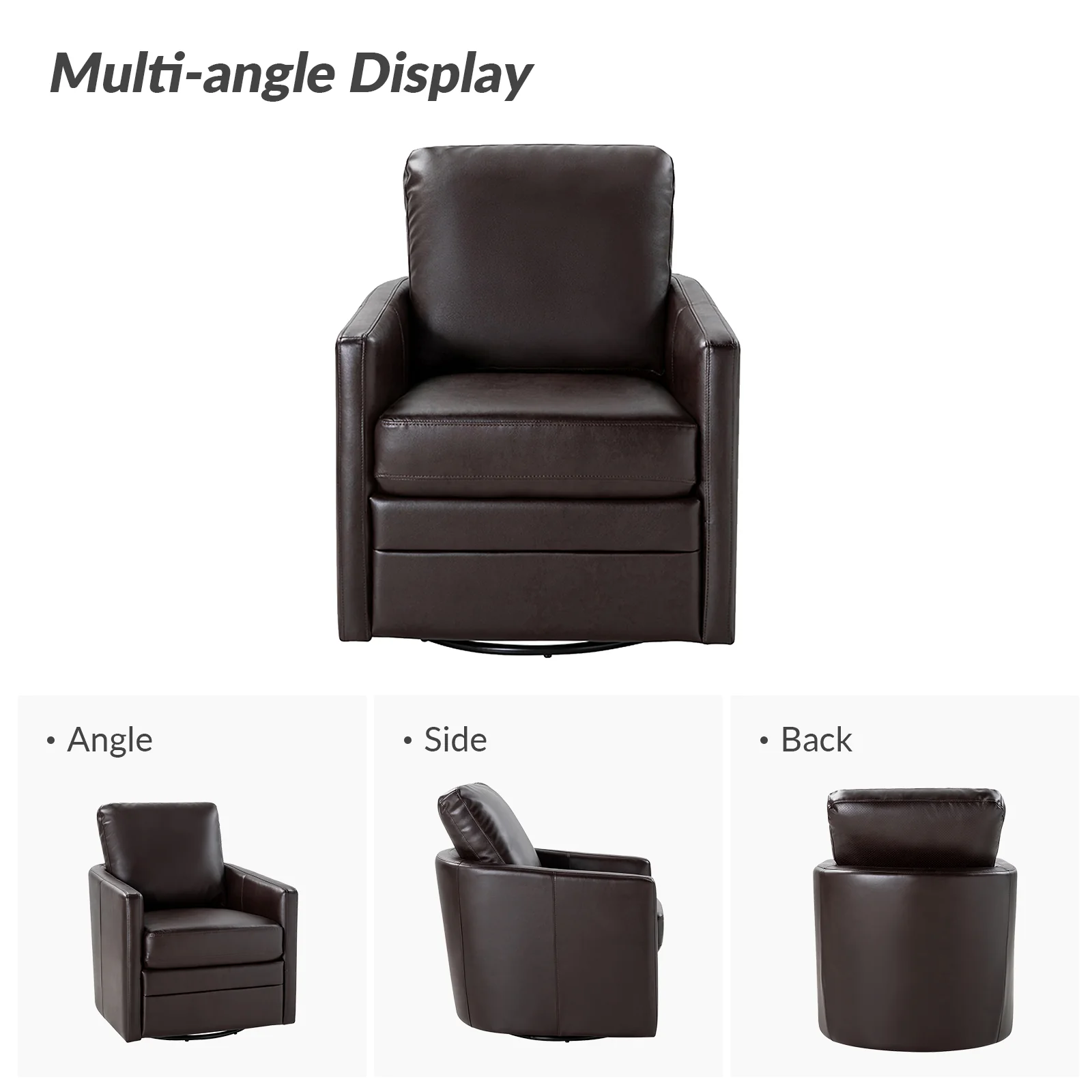 This swivel chair features PU leather upholstery and a sleek metal base for a gorgeous look in your living room. Its frame is made from solid and manufactured wood, and its circular metal base has a black finish that complements any color palette. The back cushion can not be fixed so you can remove it as your need, and the core can take out. It allows you to rest in a variety of ways and they can enhance comfort, durability, and resistance to the tests of time. The chair's comfort belies its sturdy and durable PU, built-in pocket spring, and sturdy construction. Let your body sink into the foam-filled soft upholstery, and recline the back for the ultimate in relaxation after a stressful day. This swivel chair will create a cozy, contemporary look for years to come.