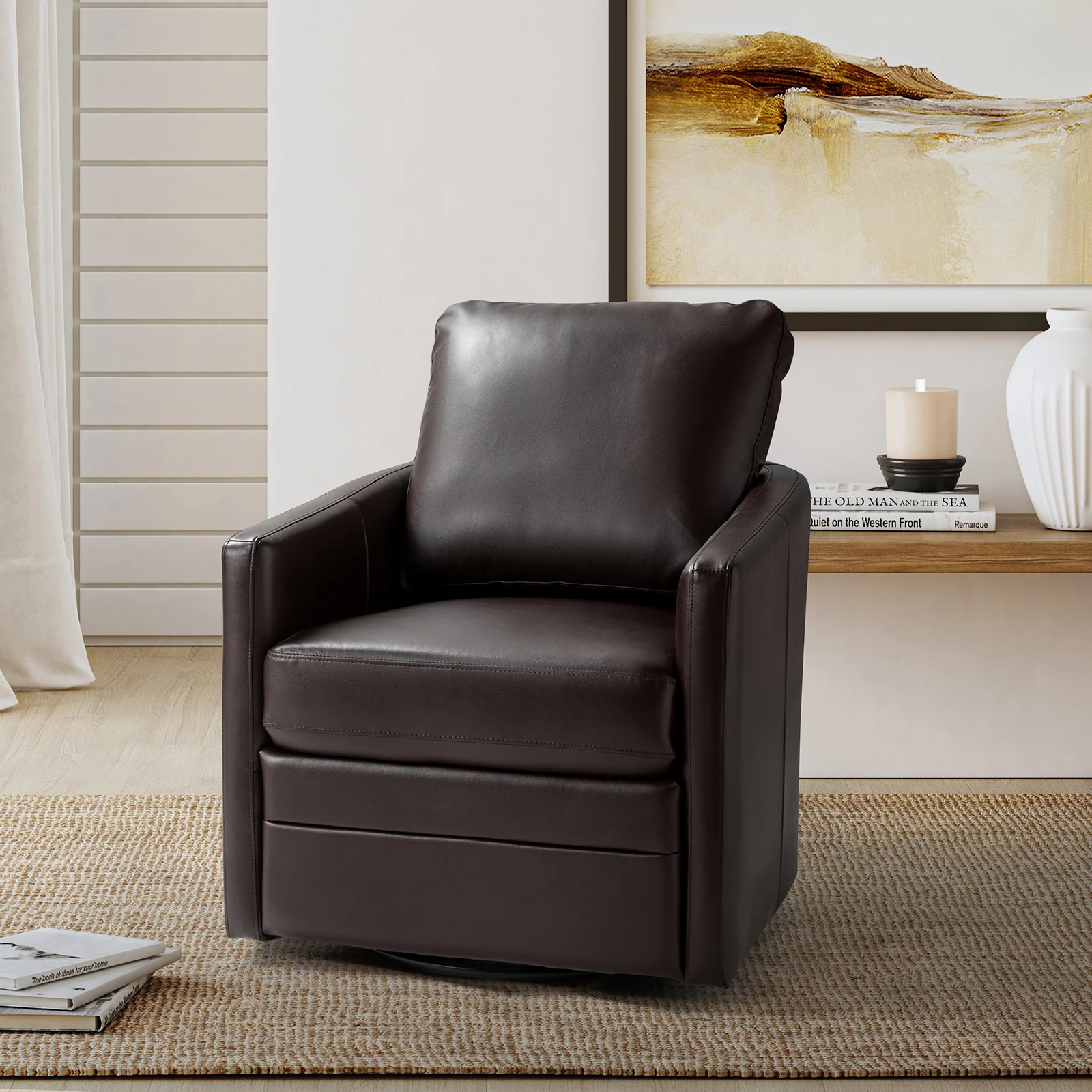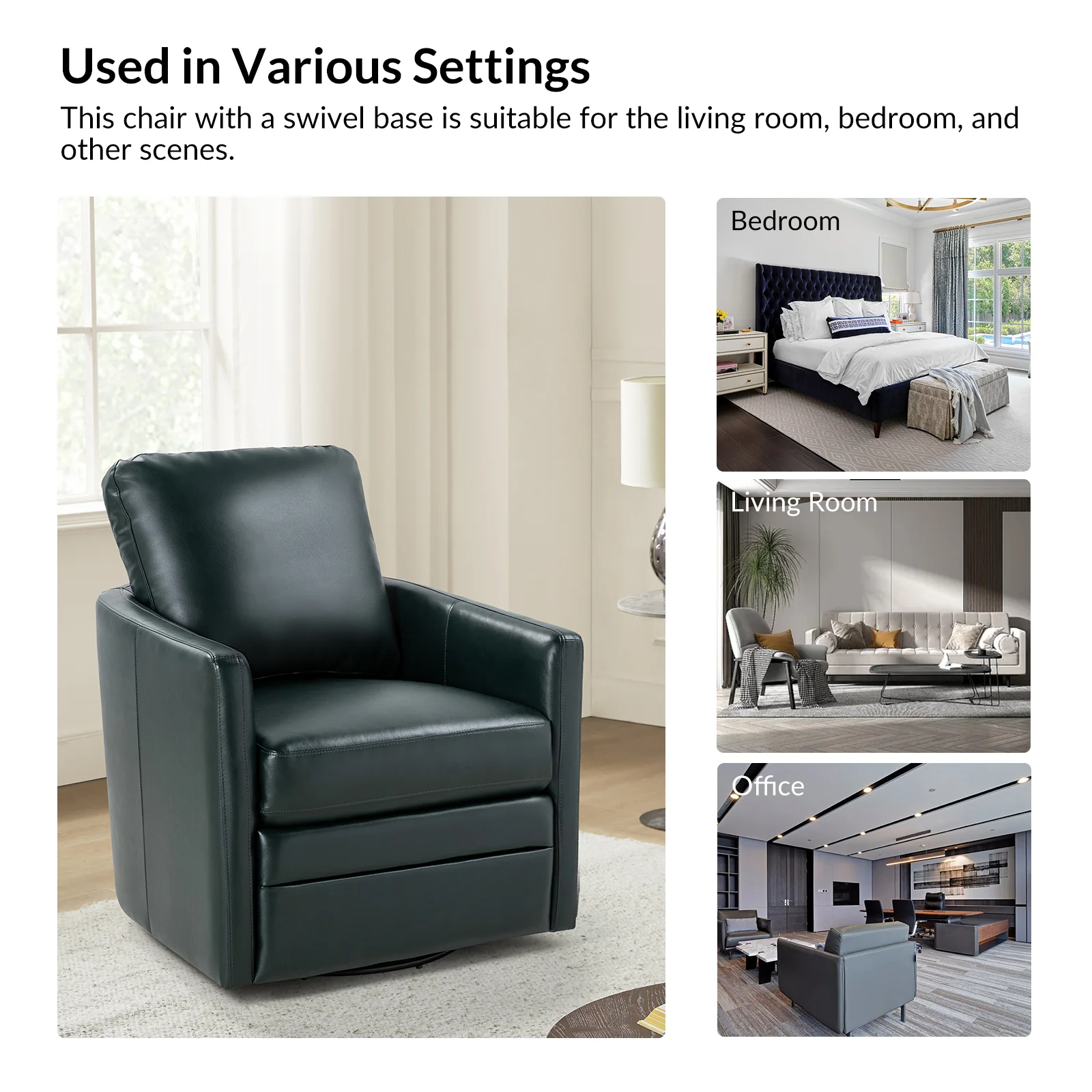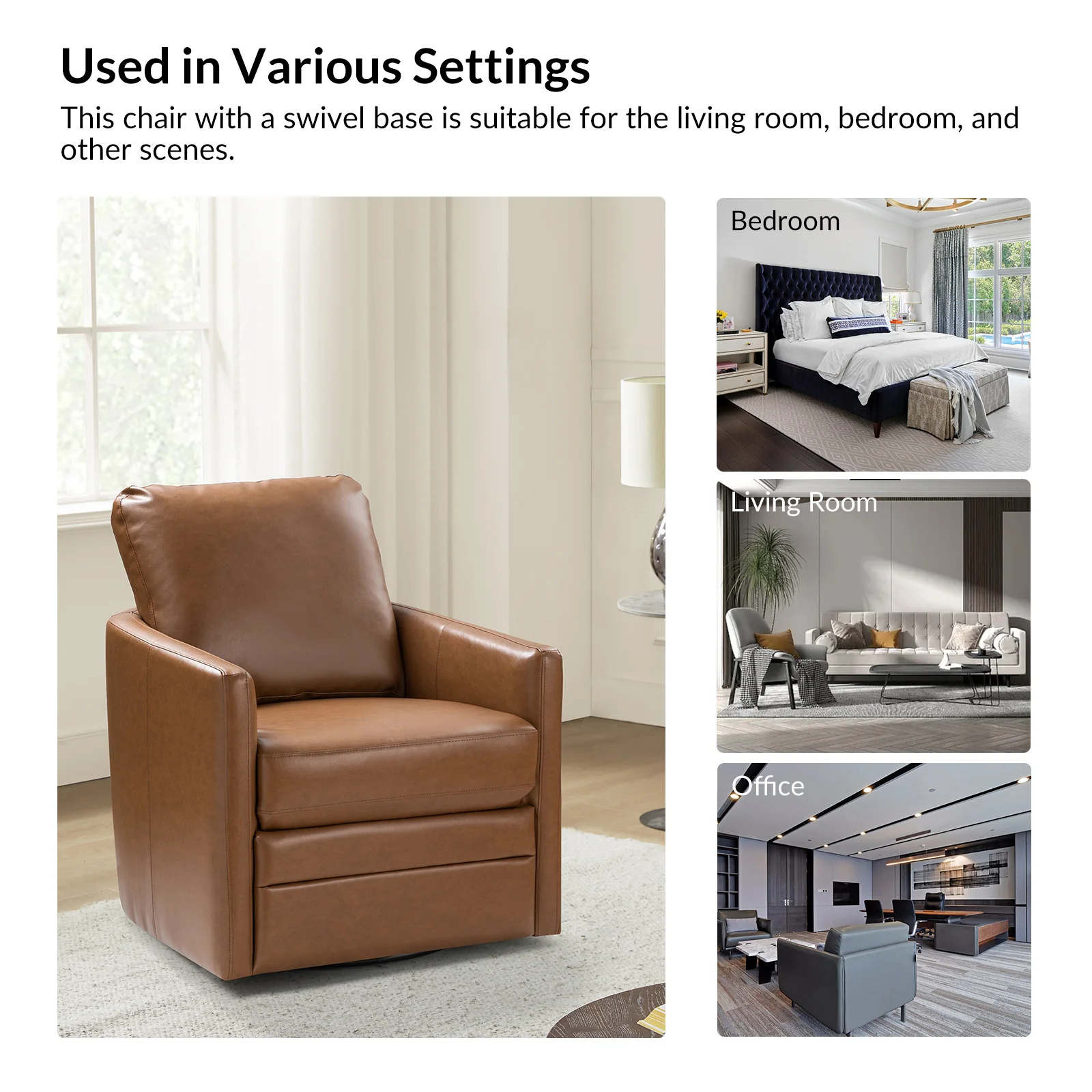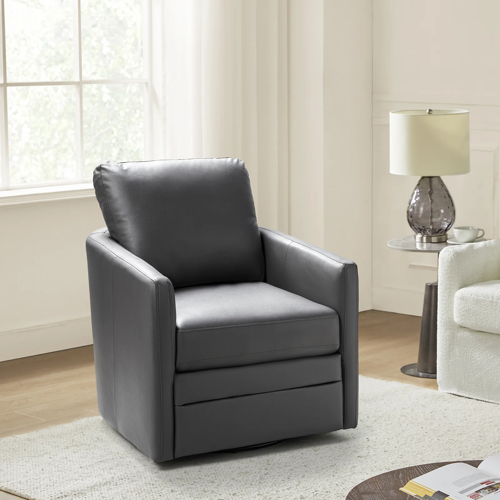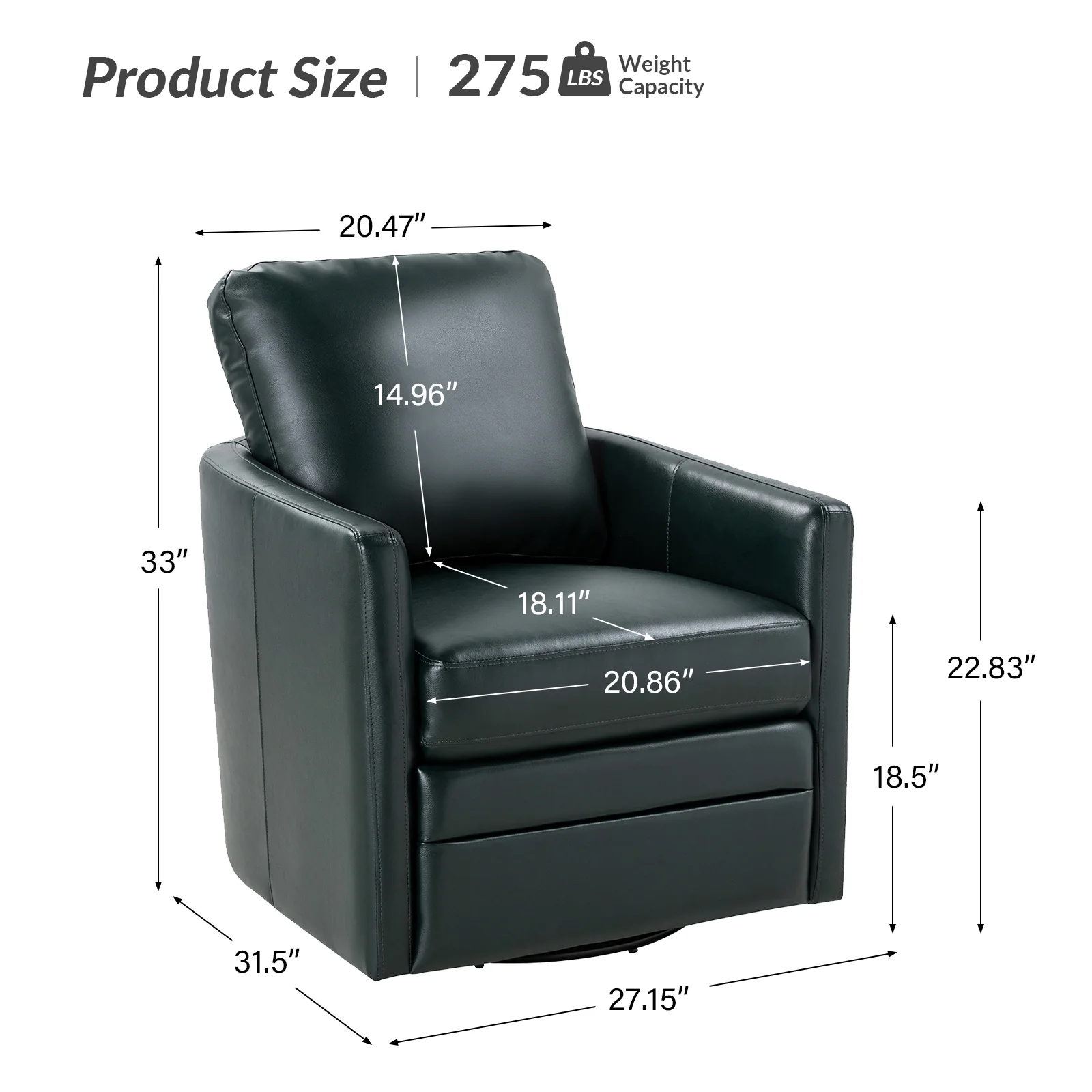 This swivel chair features PU leather upholstery and a sleek metal base for a gorgeous look in your living room. Its frame is made from solid and manufactured wood, and its circular metal base has a black finish that complements any color palette. The back cushion can not be fixed so you can remove it as your need, and the core can take out. It allows you to rest in a variety of ways and they can enhance comfort, durability, and resistance to the tests of time. The chair's comfort belies its sturdy and durable PU, built-in pocket spring, and sturdy construction. Let your body sink into the foam-filled soft upholstery, and recline the back for the ultimate in relaxation after a stressful day. This swivel chair will create a cozy, contemporary look for years to come.