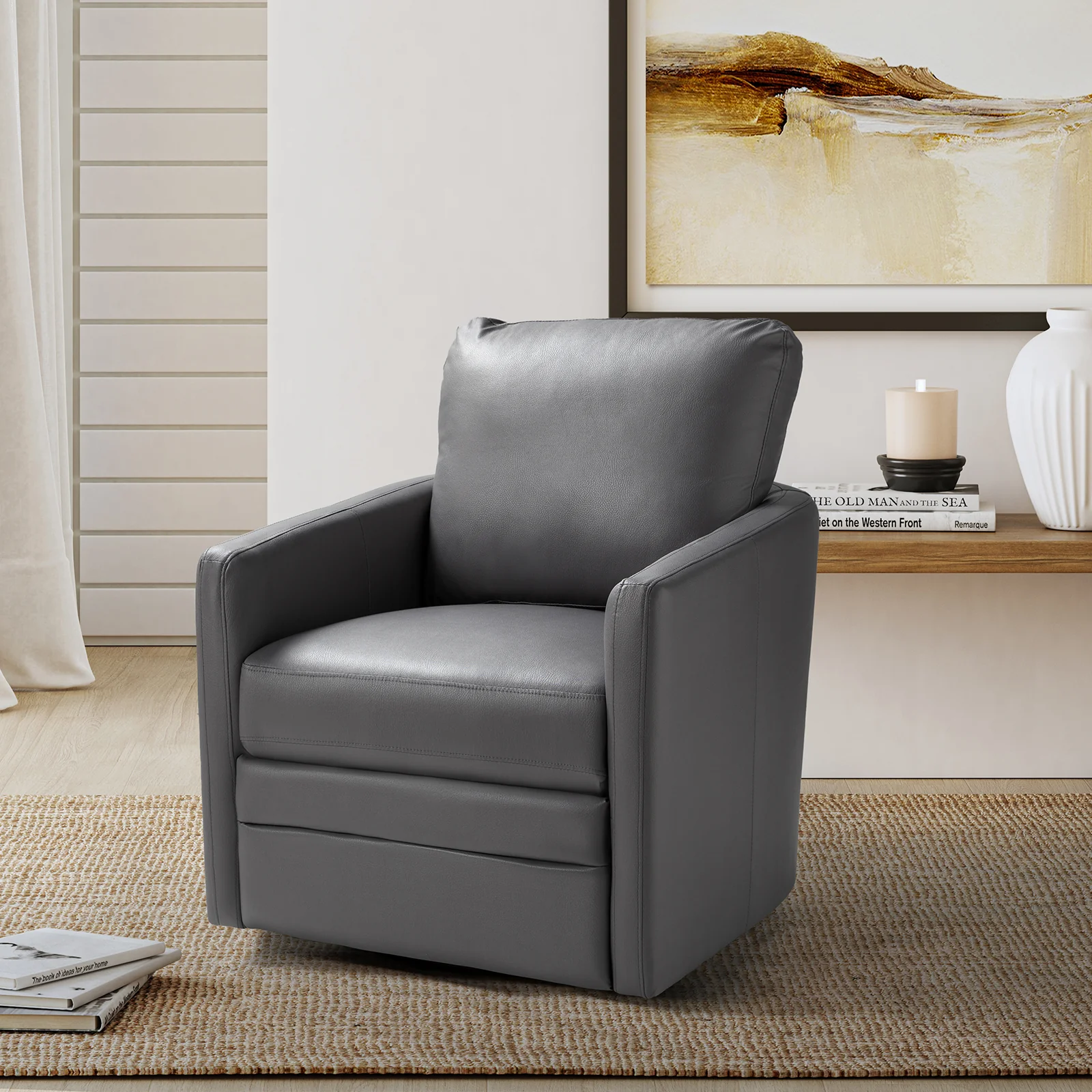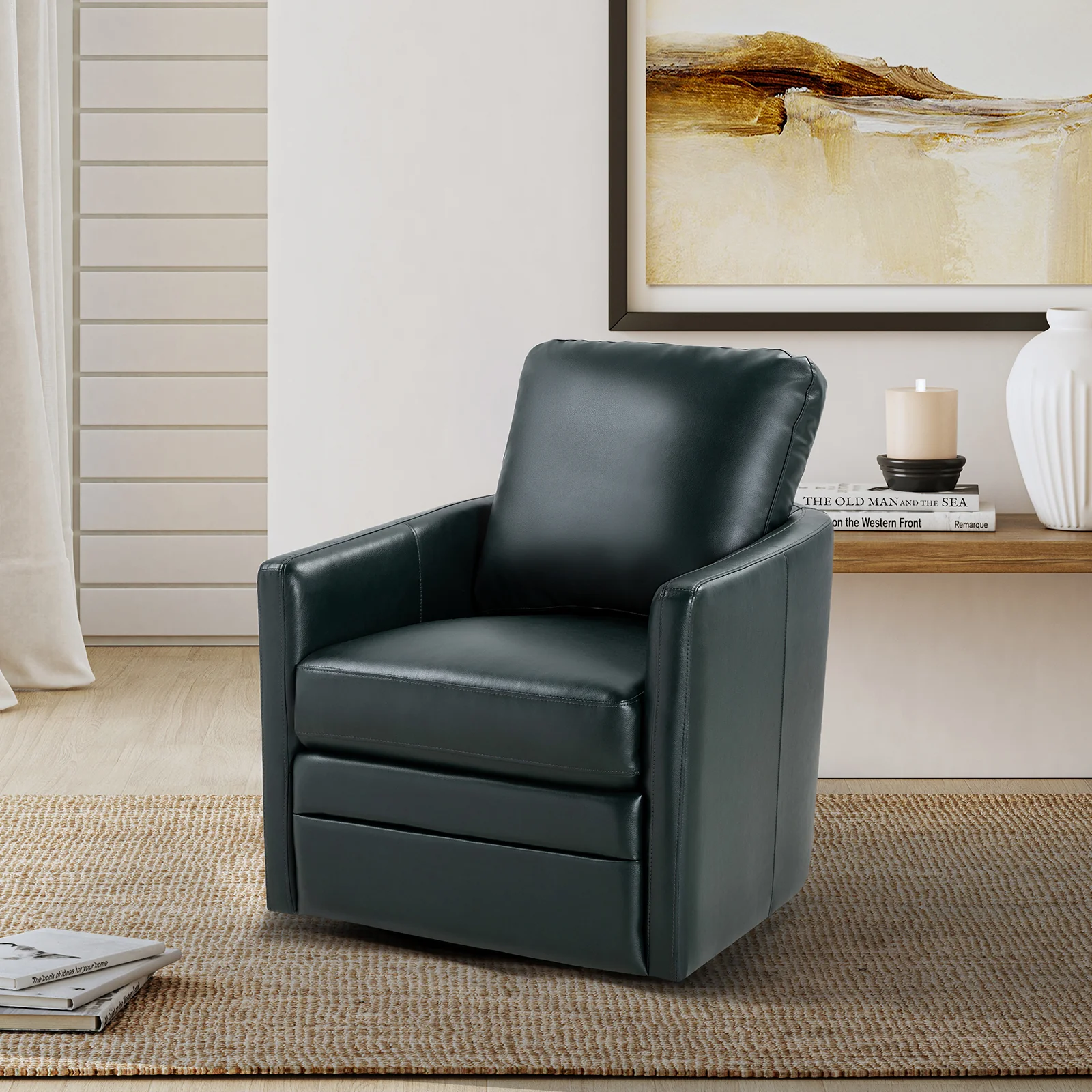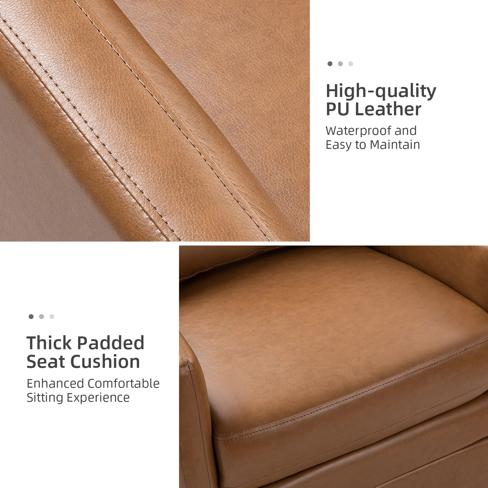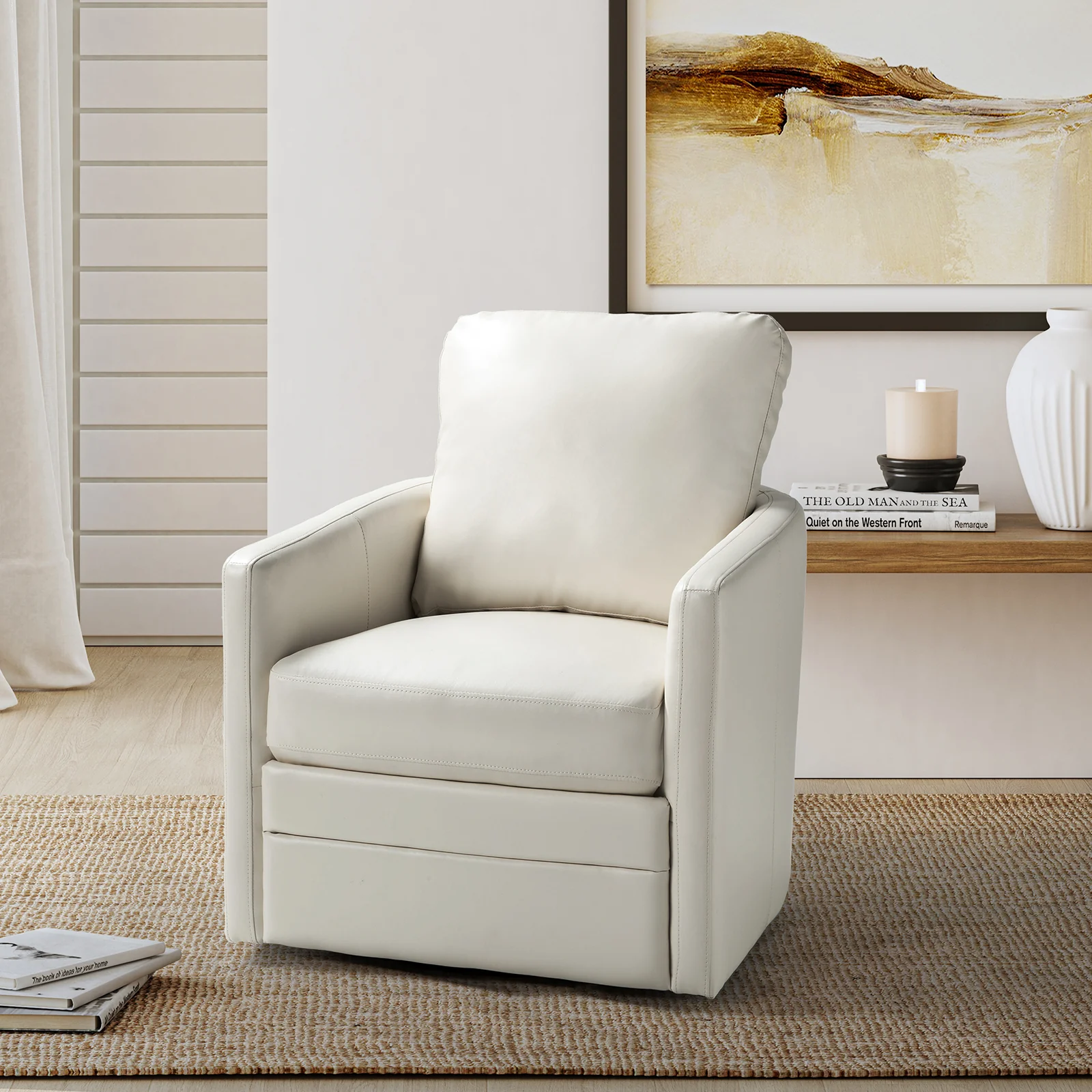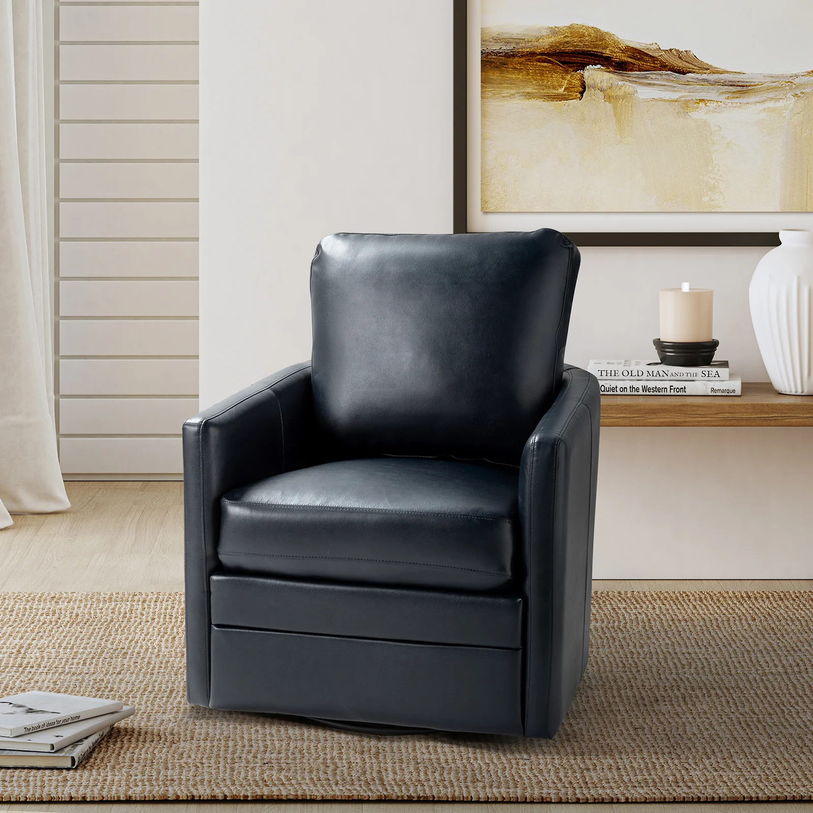 This swivel chair features PU leather upholstery and a sleek metal base for a gorgeous look in your living room. Its frame is made from solid and manufactured wood, and its circular metal base has a black finish that complements any color palette. The back cushion can not be fixed so you can remove it as your need, and the core can take out. It allows you to rest in a variety of ways and they can enhance comfort, durability, and resistance to the tests of time. The chair's comfort belies its sturdy and durable PU, built-in pocket spring, and sturdy construction. Let your body sink into the foam-filled soft upholstery, and recline the back for the ultimate in relaxation after a stressful day. This swivel chair will create a cozy, contemporary look for years to come.